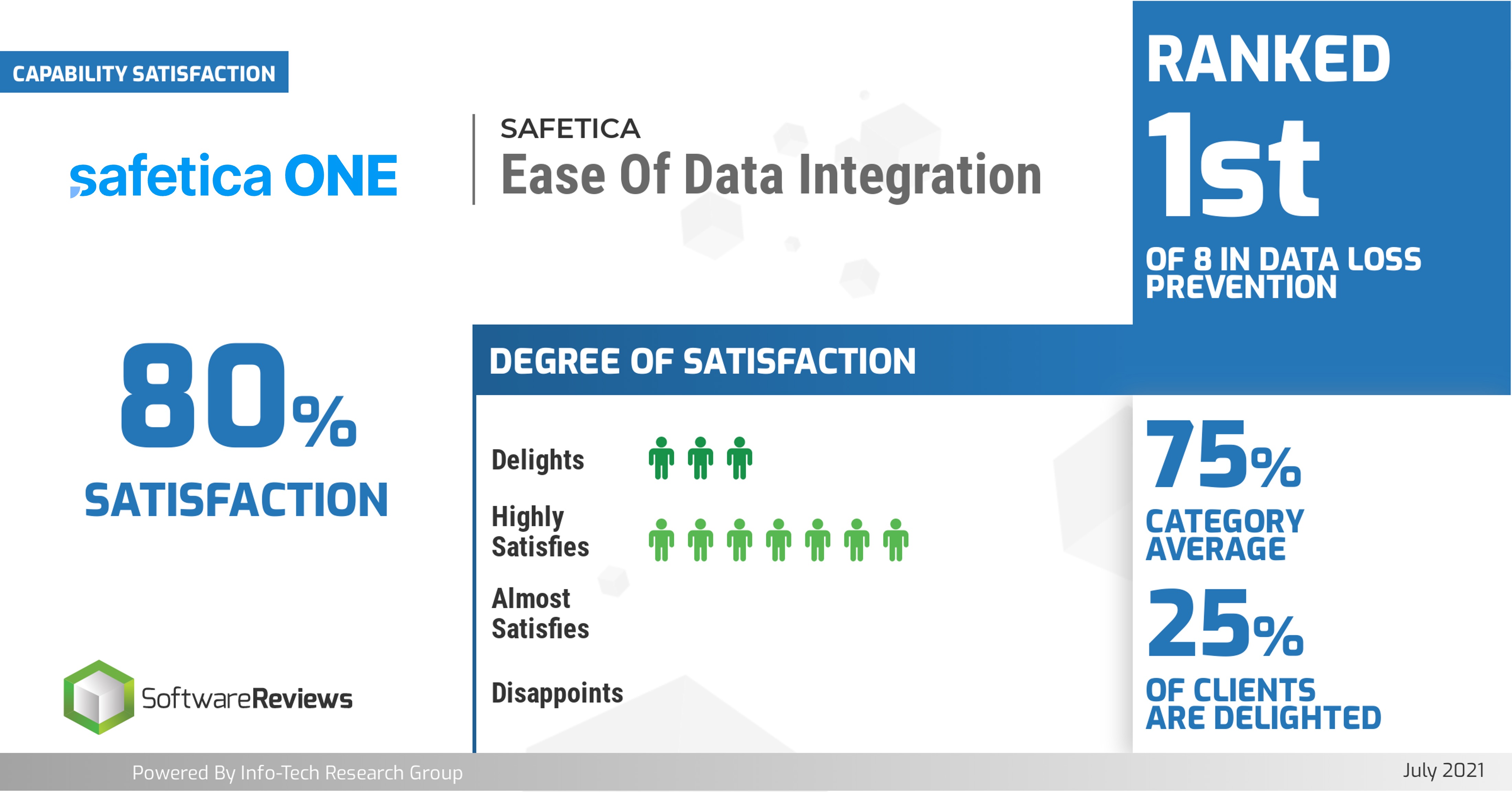 SoftwareReviews hodnotí řešení DLP na základě zpětné vazby od koncových uživatelů, ti ji poskytli v rámci komplexního online průzkumu. Poskytovatelé jsou hodnoceni na základě několika faktorů: 11 schopností, vlastnosti produktu, pravděpodobnost doporučení a emocionální vnímání. Z těchto faktorů se spočítá složené skóre. Společnost McAfee získala za rok 2021 složené skóre 8,9/10, těsně ji následovala Safetica s 8,7/10. Celou zprávu si můžete přečíst zde.