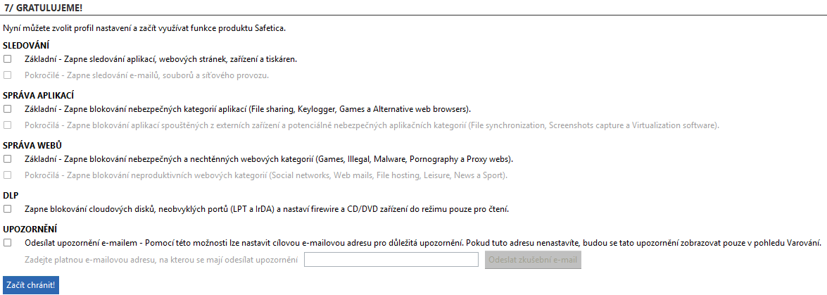 - Pokročilé – navíc aktivuje sledování emailů, souborů a síťového provozu