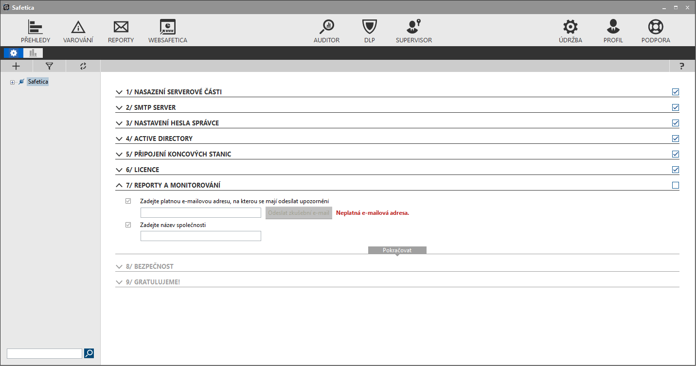 V průvodci prvního spuštění po instalaci Safetica zadá IT administrátor nebo jiná zodpovědná osoba svůj e-mail, na který budou chodit příslušná upozornění. Díky tomu může rychle reagovat na problémy a vyhodnocovat bezpečnostní situace.