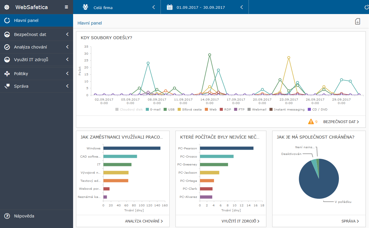 Jakmile spustíte WebSafetica 9.0, hlavní panel poskytne detailnější informace. Dozvíte se, jestli na některém z komunikačních kanálů nejsou bezpečnostní problémy nebo se tok dat výrazně nevychyluje z normálu a nově také jak Safetica celkově chrání prostředí organizace.