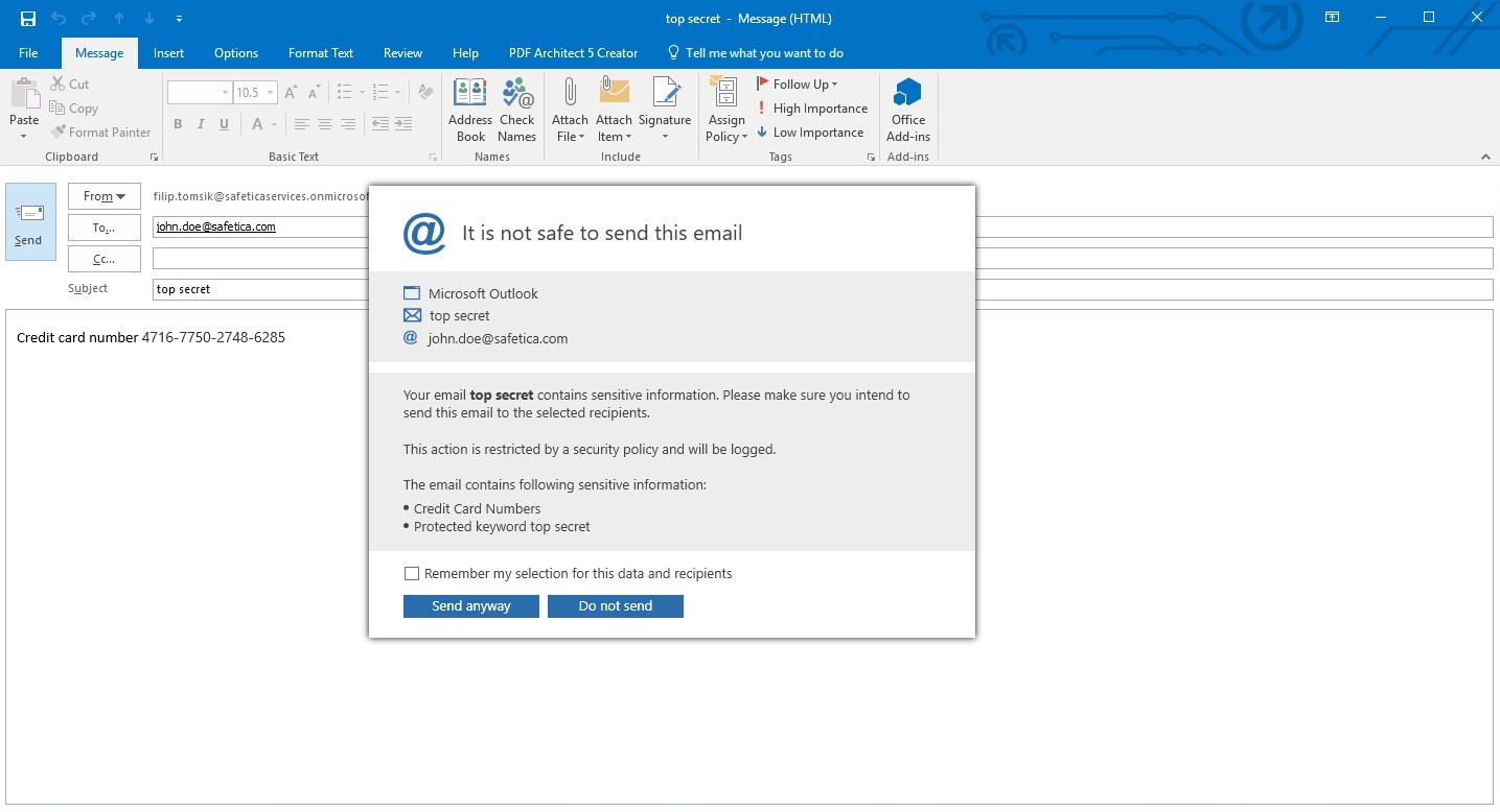 Safetica can newly discover defined sensitive content in emails. The user is informed when he tries to send such email and if he decides to send it, an audit log is stored in the DLP protocol.