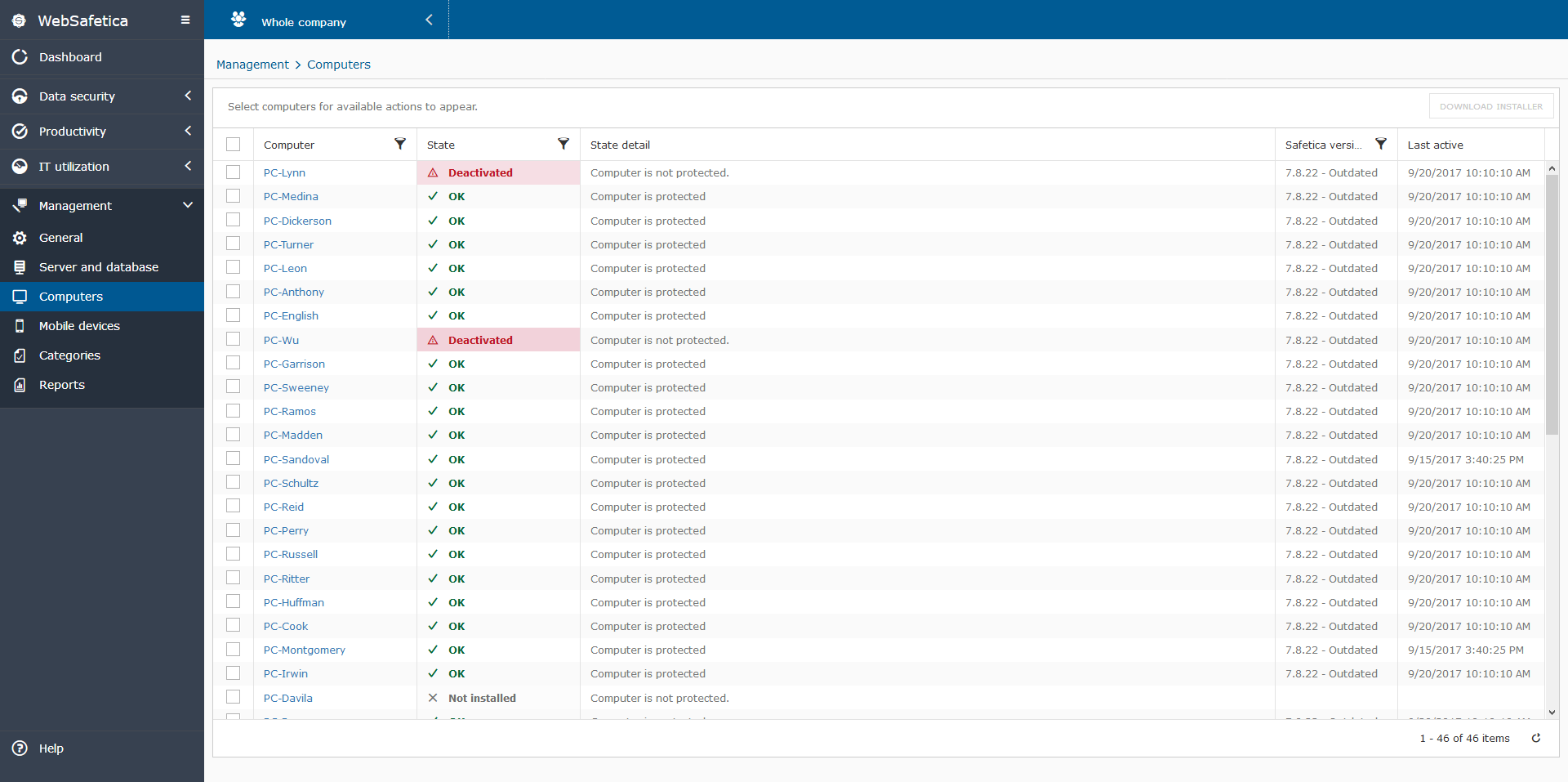 Web-based Safetica console now offers basic administration tools – add new clients, update the product, insert new license or categorize unknown webs and apps.