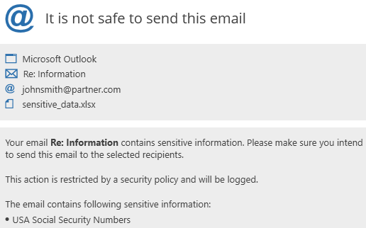 Even if you decide not to scan and categorize your potentially sensitive files, Safetica can still notify your users when they are about to send an email which includes potentially sensitive data. This way you can educate your employees about working with sensitive data without restricting their workflow in any way.
