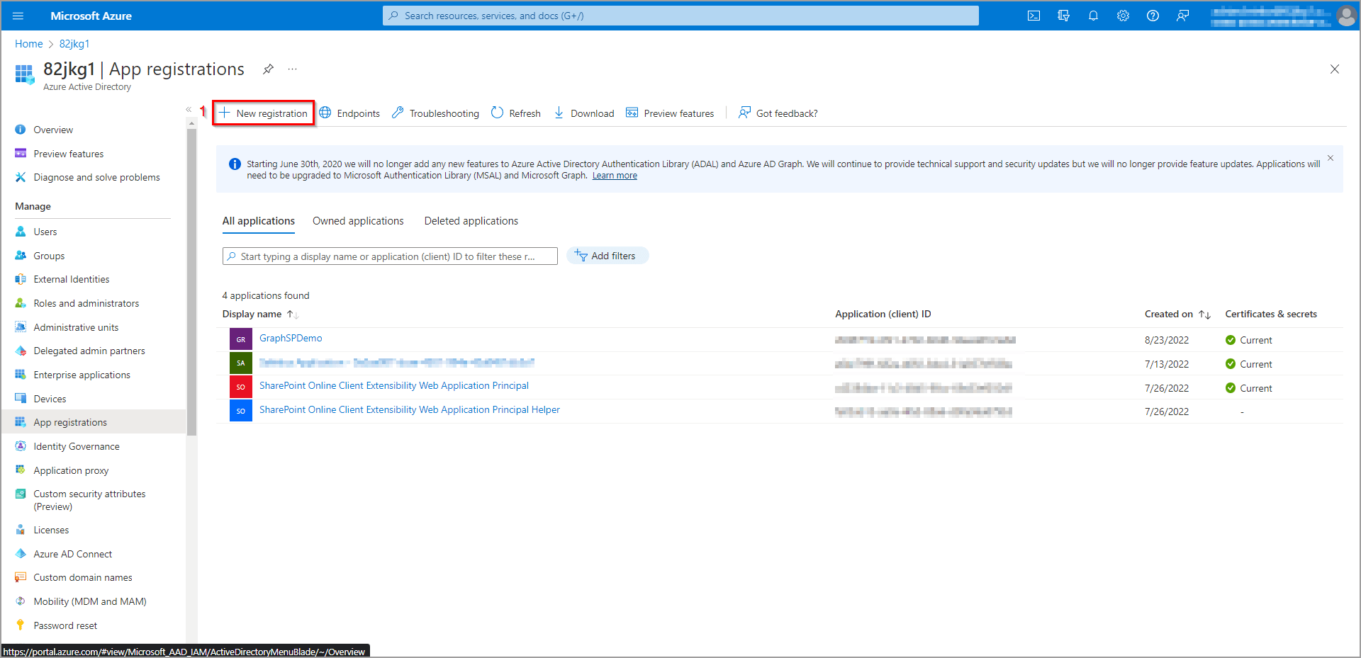 Similarly to users, there is a list of registered apps (see figure 8). These apps can be managed directly from the list. Let’s create a new application by clicking the New registration button.