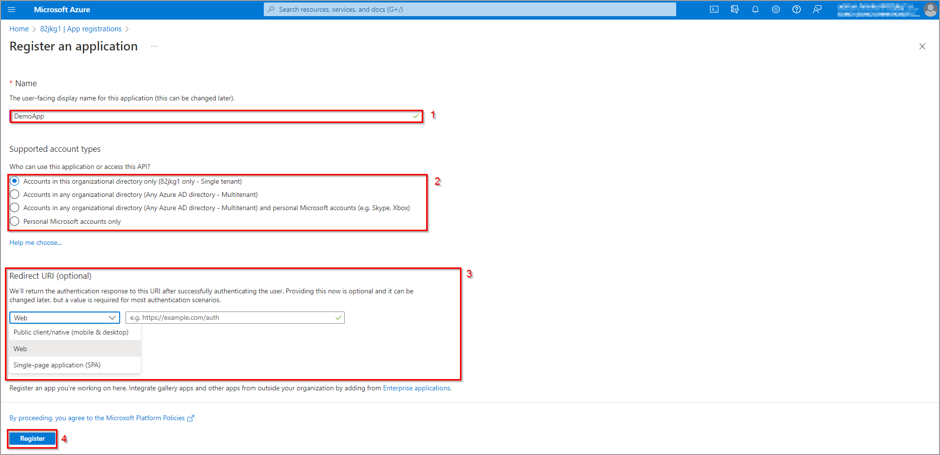 The last step is to set up Redirect URI (3, optional). This is the URI, where the authentication response will be returned to. From here, we can obtain the authorization code to be exchanged for the access token (for more info, check OAuth2 or OpenID connection protocols). Finally, after we have everything set, we can click the Register button.