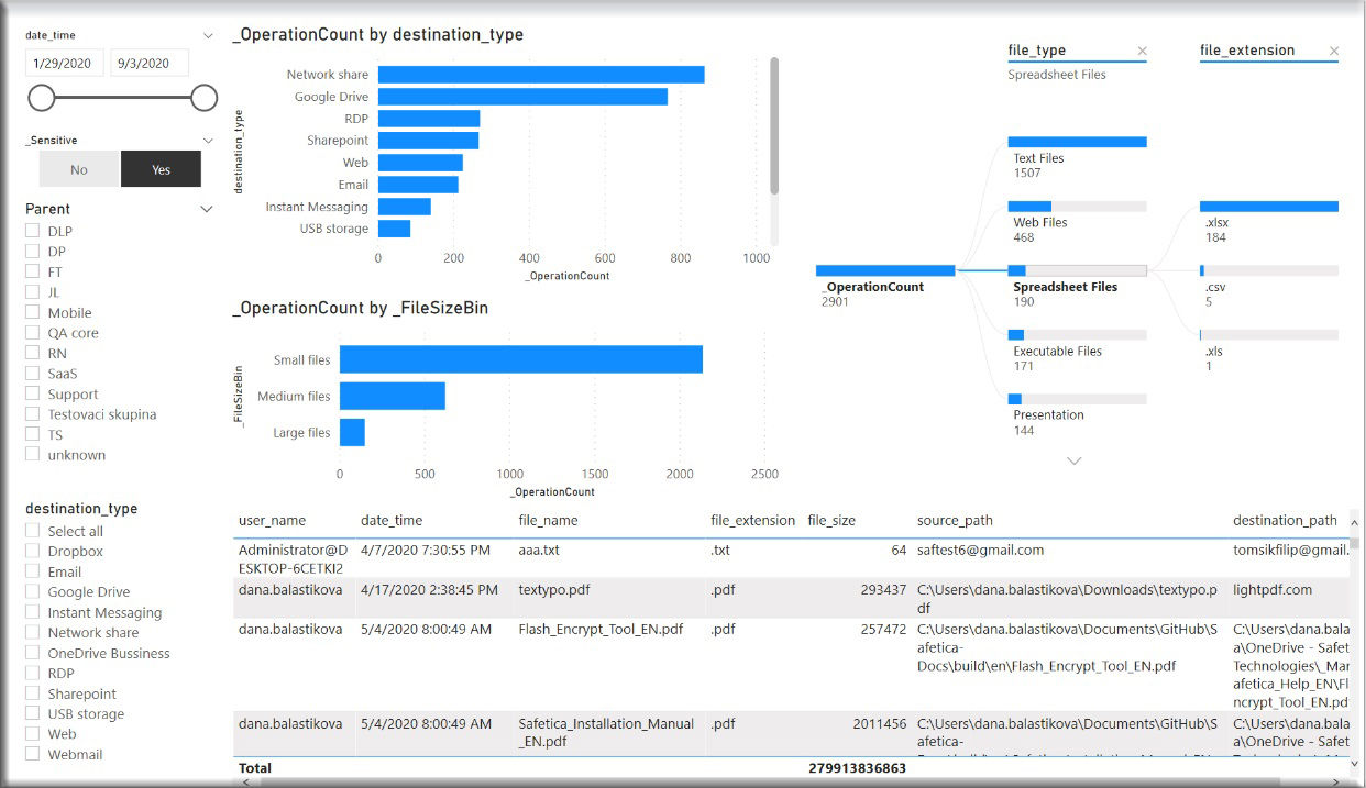 That is why we implemented an API for integrating Safetica with reporting services such as PowerBI or Tableau to enable more advanced data analytics and visualization or inclusion of data protection statistics to broader/custom cybersecurity dashboards.
