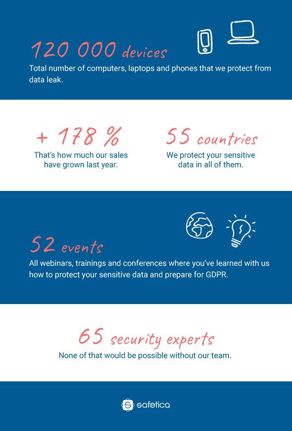2017 has brought us new faces, business partners, GDPR buzz and product improvements. Join us in looking back at our achievements and find out what´s ahead for Safetica in 2018.