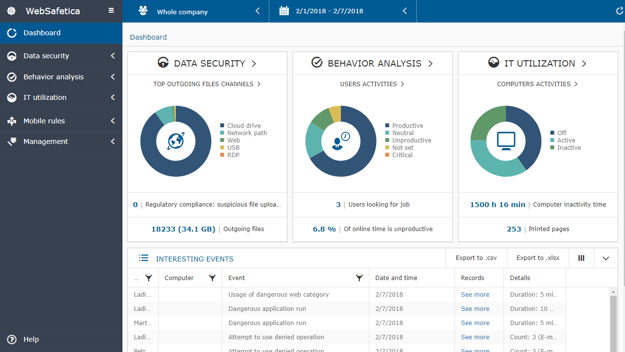 The web console got another facelift and UX upgrade. We’ve removed elements that was not particularly important to see right after opening WebSafetica. Our UX guys worked hard to make WebSafetica more user friendly. Now you can learn about all incidents from your favorite web browser in an always improving WebSafetica. If there was something important or potentially harmful happening in the company while your administrator was not watching, they’ll see it right away in the dashboard.