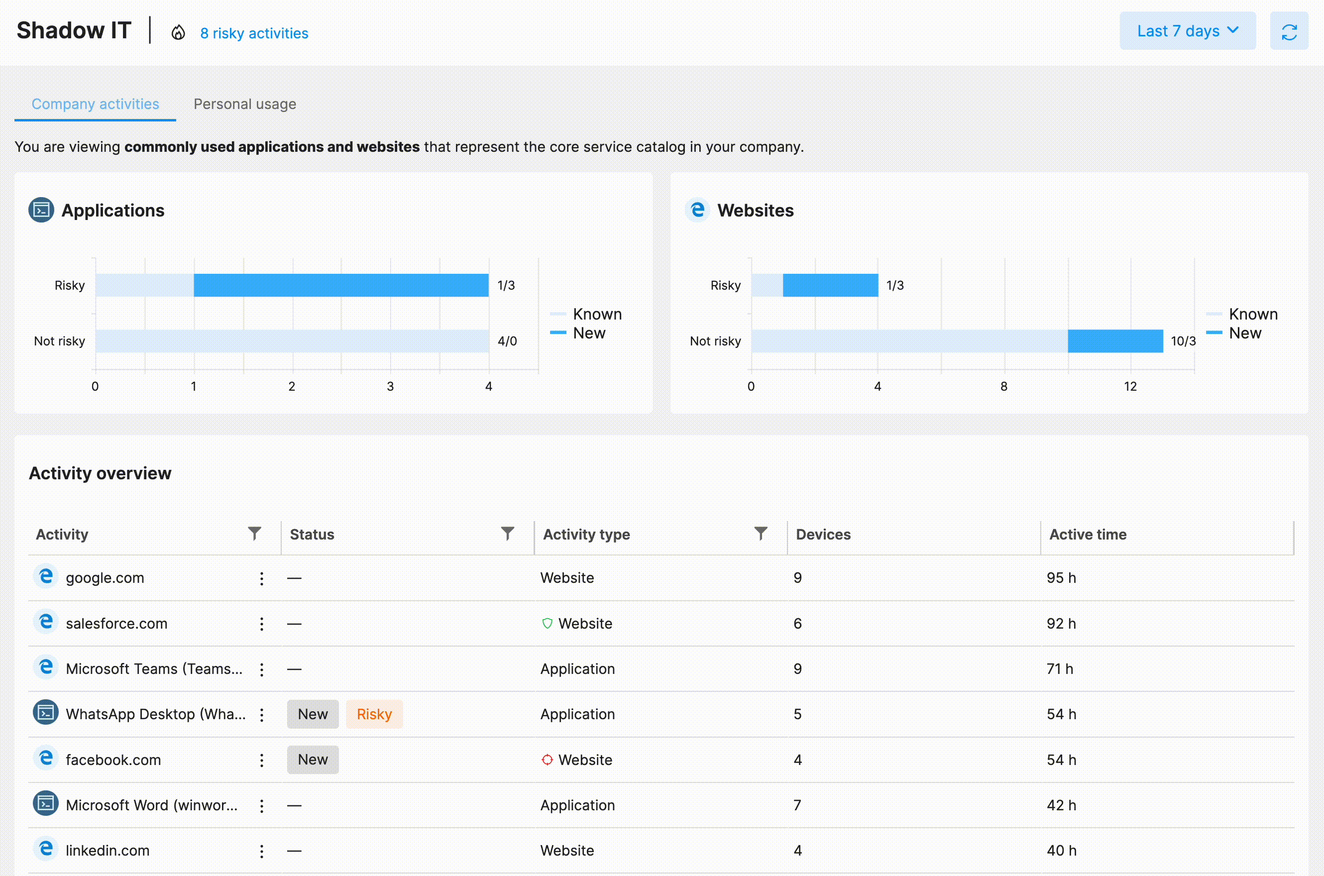 Through the Shadow IT feature of Safetica NXT, the admin user can conveniently review the company's software and web application catalog and keep track of any unwanted applications or websites. Safetica NXT's intelligent analysis and automated risk detection make this task effortless.