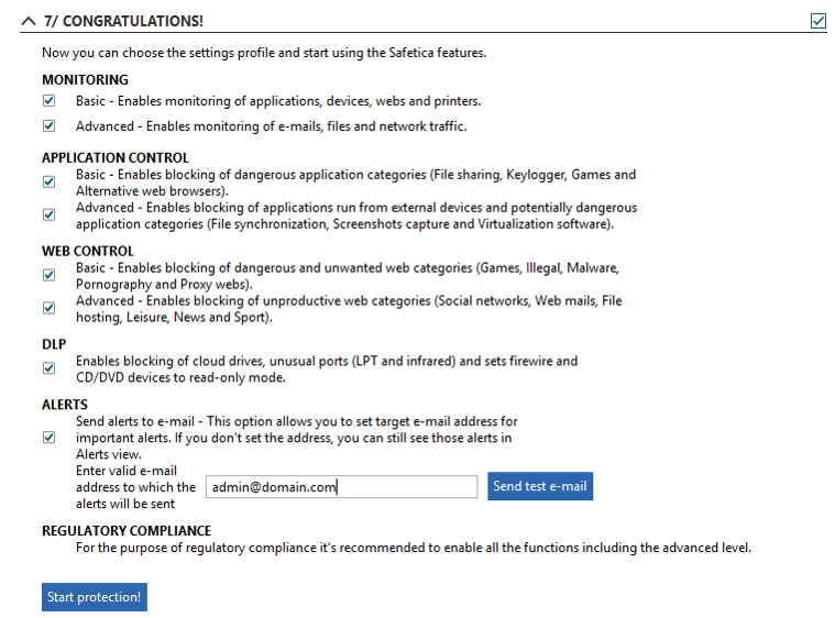 Safetica 7.5 makes these preparations easier with pre-configured Monitoring, Application and Web Control, and DLP scenarios. You can enable these automatically during the first installation of Safetica: