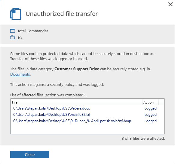 On the user side, Safetica 7.5 brings new pop-ups that explain in much more detail why was some action blocked or restricted, and you can even change the location of the pop-ups so that they don’t overlap important parts of you business applications: